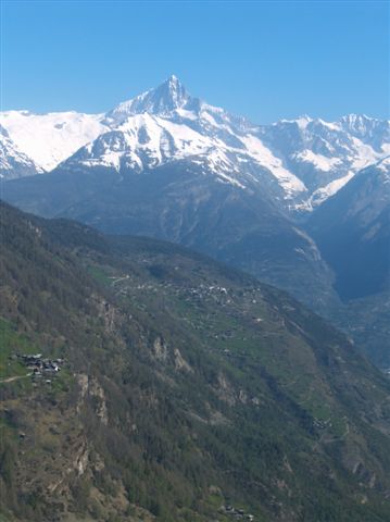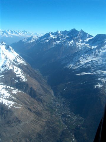 In nördlicher Richtung folgen wir dem Mattertal. Zermatt bleibt unter uns zurück, links ragt die mächtige Schneewand des Weisshorns(4506), vorbei geht es an den Geröllmassen des Felssturzes von Randa. In der Ferne leuchten nun schon die Industrieanlagen von Visp im Sonnenlicht.