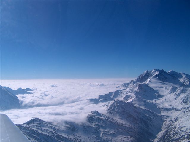 Mit verstärkter Luftraumbeobachtung -hier gibt es meist noch andere Sightseeing-Flieger- geht es nun über der riesigen, von bläulich schimmernden Spalten durchzogenen, Gletschereisfläche, vorbei am Aletschwald in südwestliche Richtung. Der Höhenmesser zeigt 9000 Fuss. Im leichten Reisesteigflug leanen wir etwas unter Beobachtung der Abgastemperaturanzeige, damit das Benzin-Luftgemisch in dieser Höhe nicht zu fett wird.
